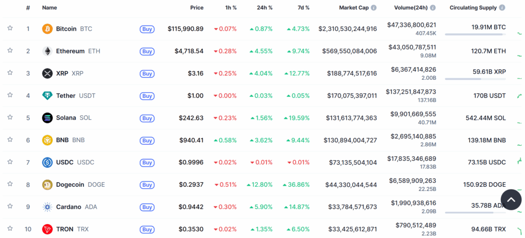 While the BTC price has soared frequently, its pace has slowed down. The flagship cryptocurrency only rose by 0.87% over the last 24 hours and 4.73% since last week. BTC is being traded at $115,990.89 while drafting the article. Nevertheless, Bitcoin token still dominates the global crypto market with a market cap of 2.3 trillion.