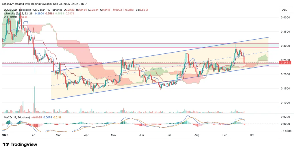 As seen in the above chart, the DOGE price is trading within a rising parallel channel, and despite a rejection at the resistance, the token has managed to sustain within the pattern. The bulls have prevented the token from entering the pivotal support zone between $0.22 and $0.23. However, there are two key observations to consider here, the Ichimoku cloud and the MACD that raise some concerns.