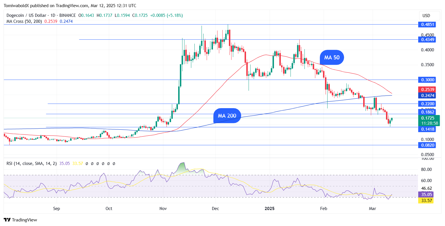 Dogecoin (DOGE), the dog-themed cryptocurrency, has rebounded after a five-day decline. At the time of writing, DOGE is up 5% in the last 24 hours, trading at $0.17. This continues its recovery from yesterday's low of $0.1427. Wednesday's price reached highs of $0.169.