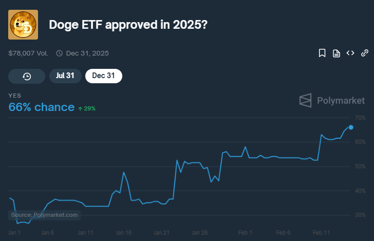 According to Polymarket data, the likelihood of a Dogecoin ETF approval has jumped to 62%, a significant increase from 27% in January. However, the probability of approval before July 31st stands at 33%.