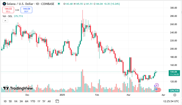 Solana also saw a modest 1.63% daily increase, trading at $144.89. Its market cap stands at $74.1 billion, and trading volume increased by 3.28% to $3.42 billion, suggesting growing investor interest. Solana's performance is boosted by its high transaction speeds and growing presence in decentralized finance (DeFi).