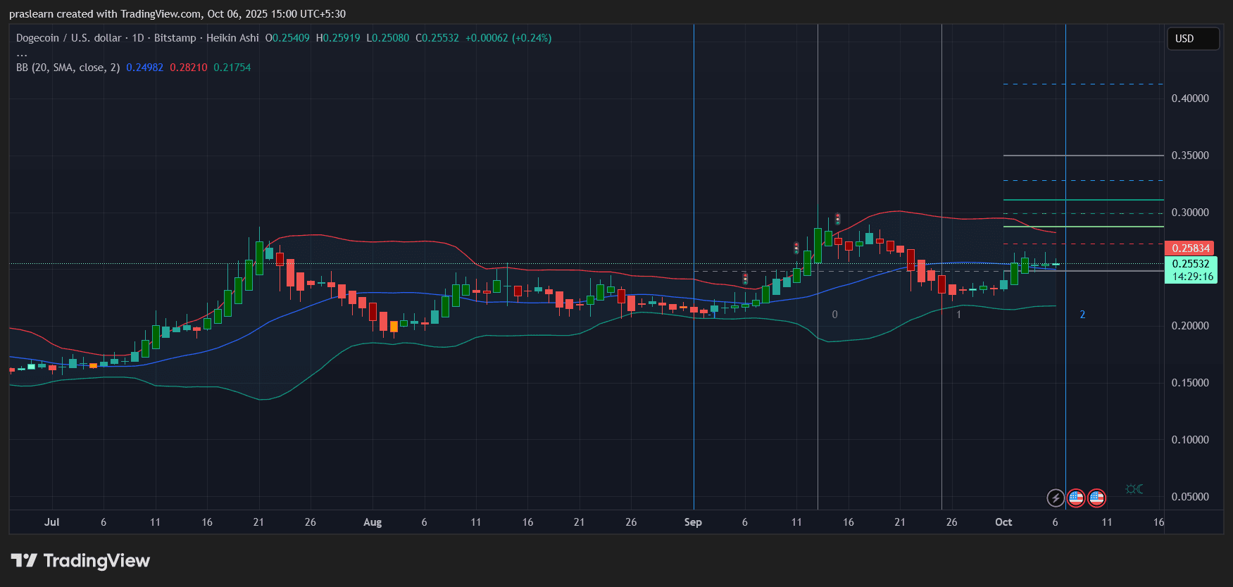 Looking at the daily chart, DOGE price is trading around 0.255 with Bollinger Bands starting to contract after a period of volatility. This signals that the coin is entering a consolidation phase. The mid-band (around 0.249) has been acting as a support, while resistance sits near 0.282. The recent bounce from the lower Bollinger Band at 0.217 shows that buyers are defending key zones.