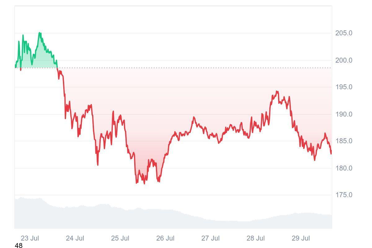 Despite a 7% price decrease this week, Solana's price remains stable near the $183 level, supported by ongoing ecosystem expansion. Its market capitalization remains strong at $98 billion, placing it among the top 10 cryptocurrencies according to CoinMarketCap.
