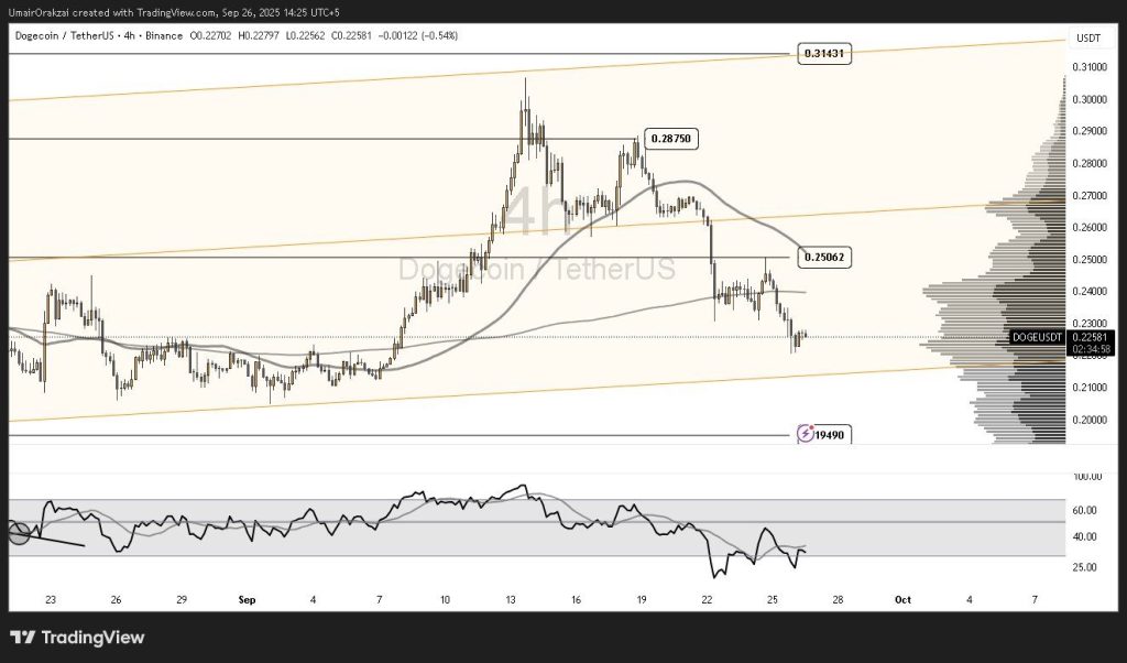 Dogecoin’s price has fluctuated significantly, with a sharp decline from $0.29 to $0.225, which marks a 23% correction. Market Analyst Umair Crypto had earlier predicted this decline, urging traders to take profits before the drop occurred. According to the latest data, the live price of Dogecoin is at $0.226, with a 24-hour trading volume of over $4 billion.