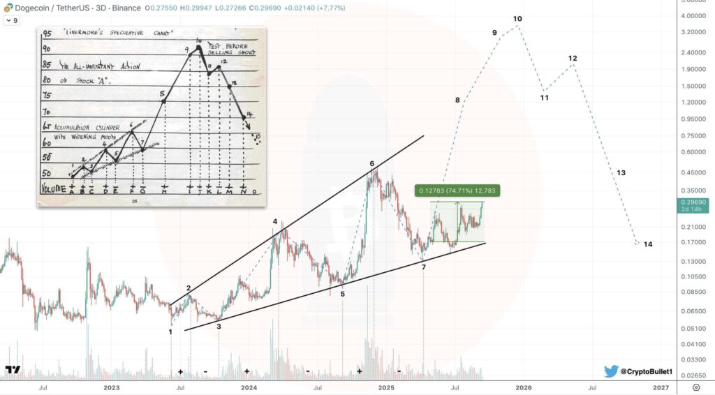 Livermore’s speculative model outlines several forward targets for Dogecoin. Point 8 projects a move toward $0.60–$0.80 if breakout momentum continues. Point 9 sets a further target near $1.50–$2.00, followed by a potential speculative peak at $3.00–$3.50 around 2026.