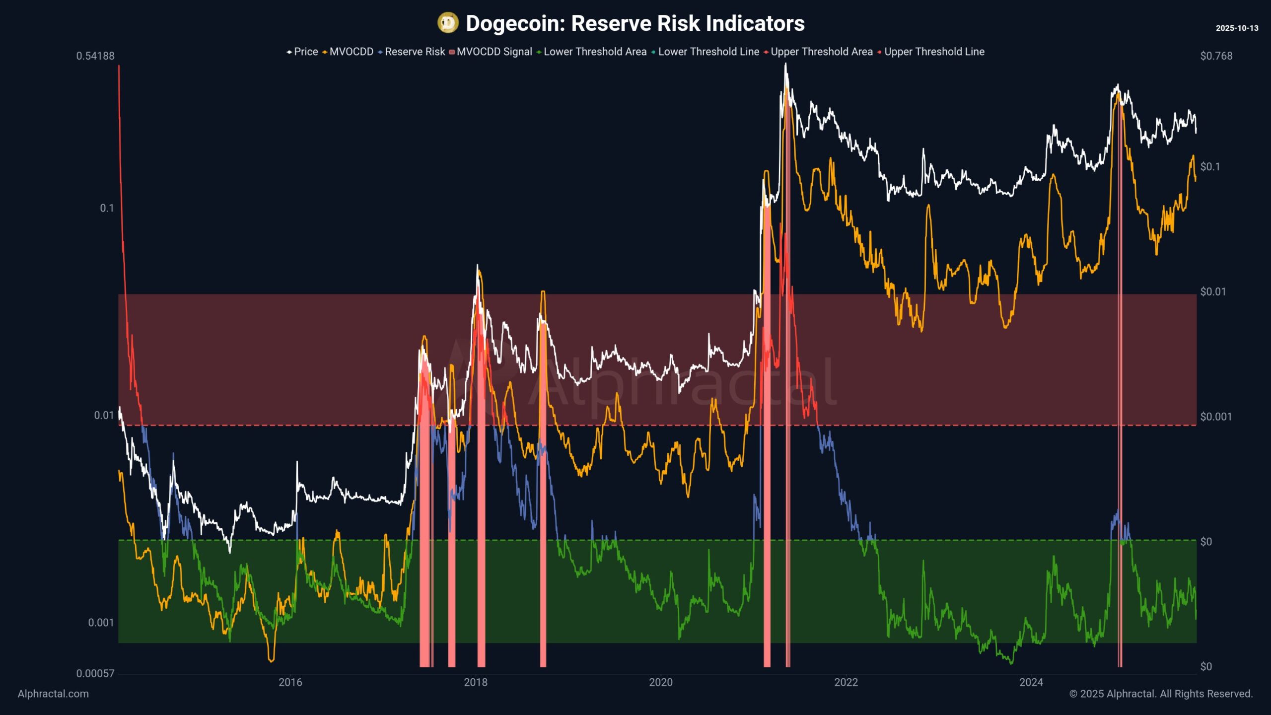 However, Wedson noted that the Reserve Risk indicator showed a comparatively weak top last year, suggesting limited conviction among long-term holders. Despite that, the same metric has consistently pinpointed every major Dogecoin top since 2016, maintaining its reliability as a cyclical gauge.