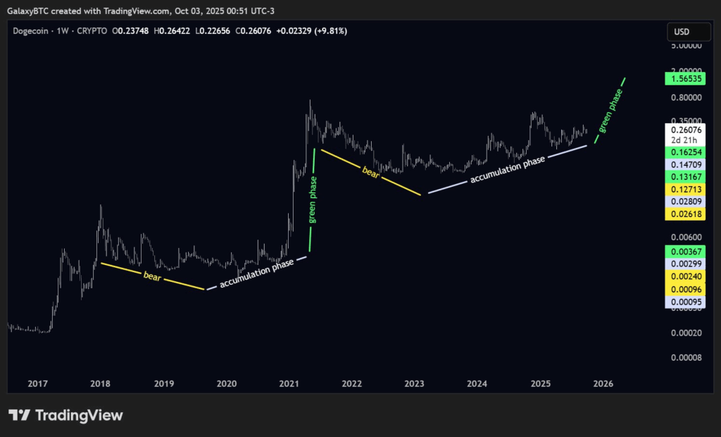 - Dogecoin follows a clear cycle: bear, accumulation, and green phases shaping its price action.