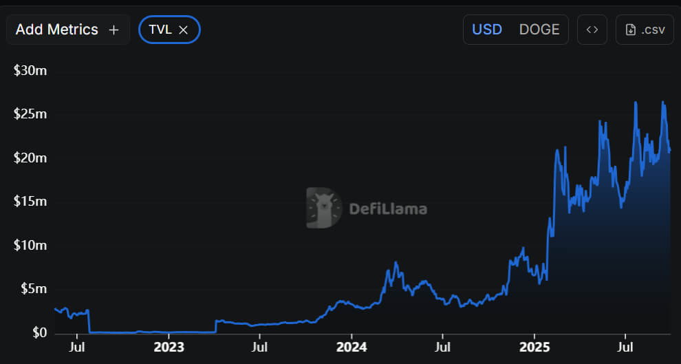 Dogecoin’s Total Value Locked in DeFi is reported at $20.27 million, according to DeFiLlama, despite a 3.90 percent daily decline. Chain fees and chain revenue both totaled $2,513 during the same timeframe, while decentralized exchange trading activity recorded no recent volume.