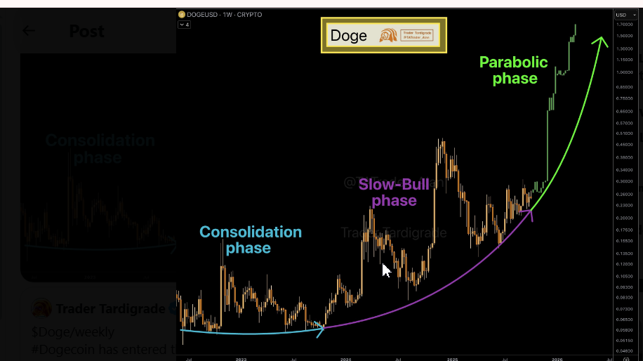 The current setup projects Dogecoin approaching the parabolic phase, marked by the steep green curve on the chart. This phase reflects accelerating price growth as demand builds above prior resistance. The price projection beyond $1.00 highlights the expanding trajectory consistent with the pattern’s curvature.
