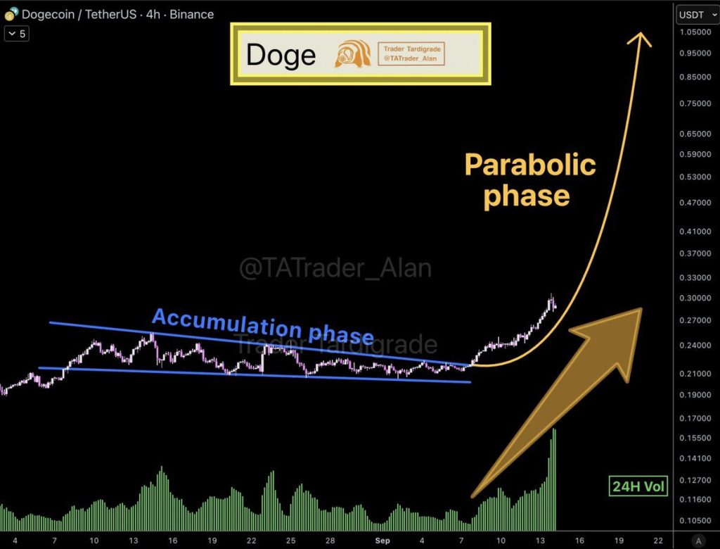 Trader Tardigrade commented, “$Doge/4-hour accumulation phase completed. The parabolic phase begins with evidence of increasing volume.” Rising volume confirms that more participants are entering the market, supporting the breakout from the earlier consolidation. Price has already advanced from $0.22 to above $0.30, reflecting growing demand.