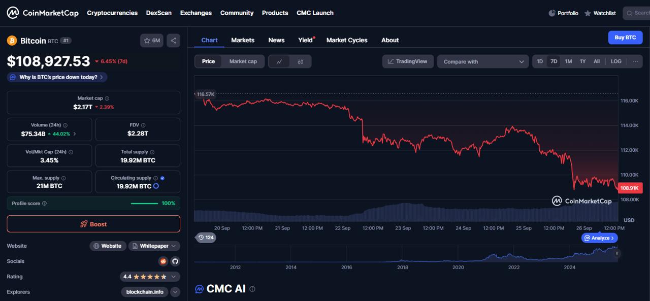 Ever since the unexpected dump on September 22, 2025, top altcoins and the market leader, Bitcoin, have been facing increased downward momentum. Currently, the BTC price stands at $108,927.53, representing a 6.45% decline in the last week alone. On the other hand, Bitcoin’s trading volume is increasing, showing that trading is active, with many day traders taking advantage of the current climate to make money via perps.