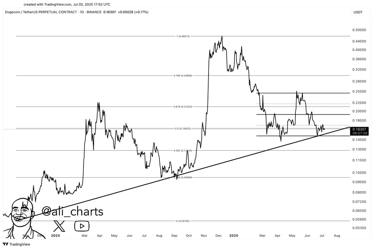 A chart presented by the crypto expert illustrates an ascending trendline, which has provided robust dynamic support since early 2024. Dogecoin recently rebounded from this rising trendline, which aligns with horizontal support just above $0.15, underscoring the importance of this price area.