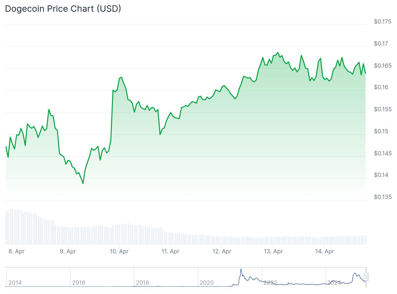According to CoinGecko, Dogecoin is currently trading at $0.1661, with a 24-hour range of $0.1616 to $0.1681. Its market capitalization is approximately $24.2 billion, making it the 8th largest cryptocurrency. 24-hour trading volume reached $886 million.