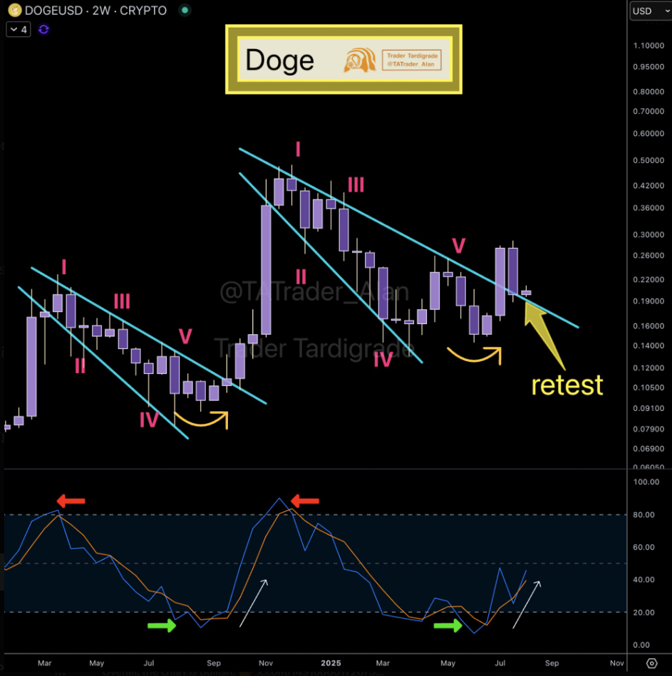 This pattern echoes historical formations that preceded substantial rallies, with the upper boundary serving as a potential target zone.