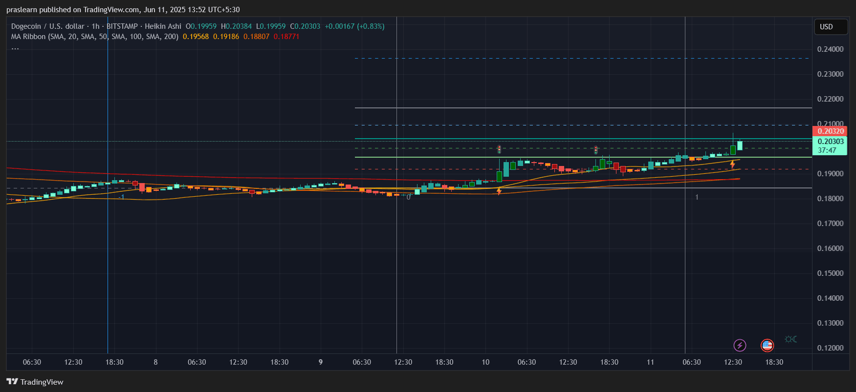 Dogecoin (DOGE) has recently surpassed the significant psychological price point of $0.20, and both the hourly and daily charts suggest this movement could be sustained. The Dogecoin price appears to be emerging from a consolidation phase, potentially positioning itself for a substantial move toward the $0.26–$0.28 range in the near future. Let's examine the charts to understand why this breakout might only be the beginning.