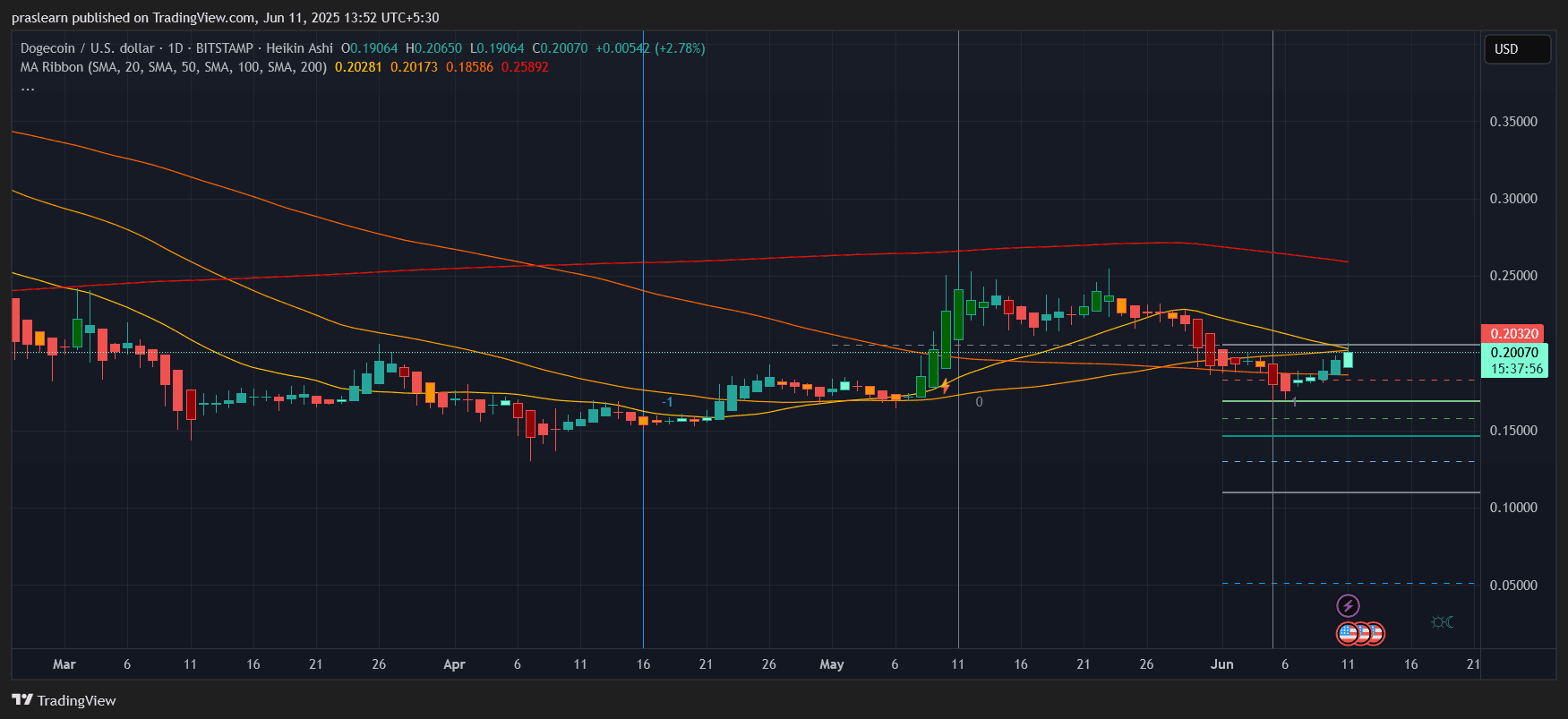 The daily chart reinforces the bullish short-term momentum. DOGE price is up, reclaiming the 50-day SMA, which is currently around $0.2017. This is noteworthy because the 50-day SMA has acted as a dynamic resistance level in recent weeks.