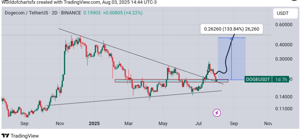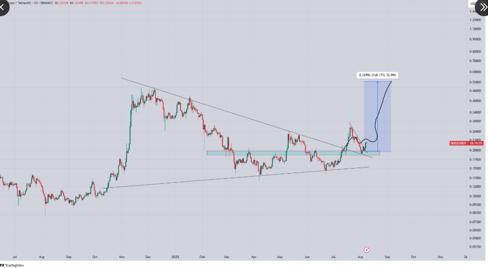 Following the Dogecoin breakout, analysts identified a key retest around the $0.20 level, which has held firm. The price experienced a slight dip after the initial rally but found strong support at the breakout point, creating a constructive setup. With the support level holding, bullish continuation has become the prevailing expectation among technical traders.