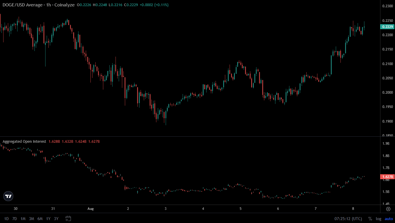 Price action on the hourly chart confirms this strength, with DOGE forming consistent higher highs and higher lows. The short-term uptrend began on August 3 and has since accelerated towards the $0.225 level. Each upward push has been accompanied by stable open interest, indicating fresh long positions rather than short covering.
