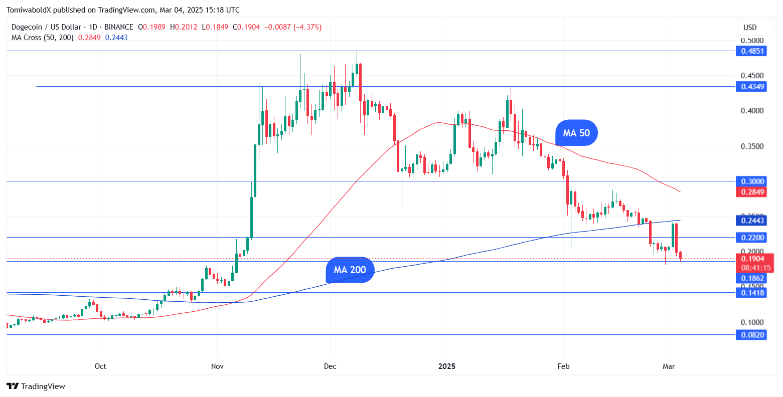 Dogecoin (DOGE), the dog-themed cryptocurrency, has fallen below the crucial $0.20 mark as the broader crypto market experiences significant selling pressure early this week.