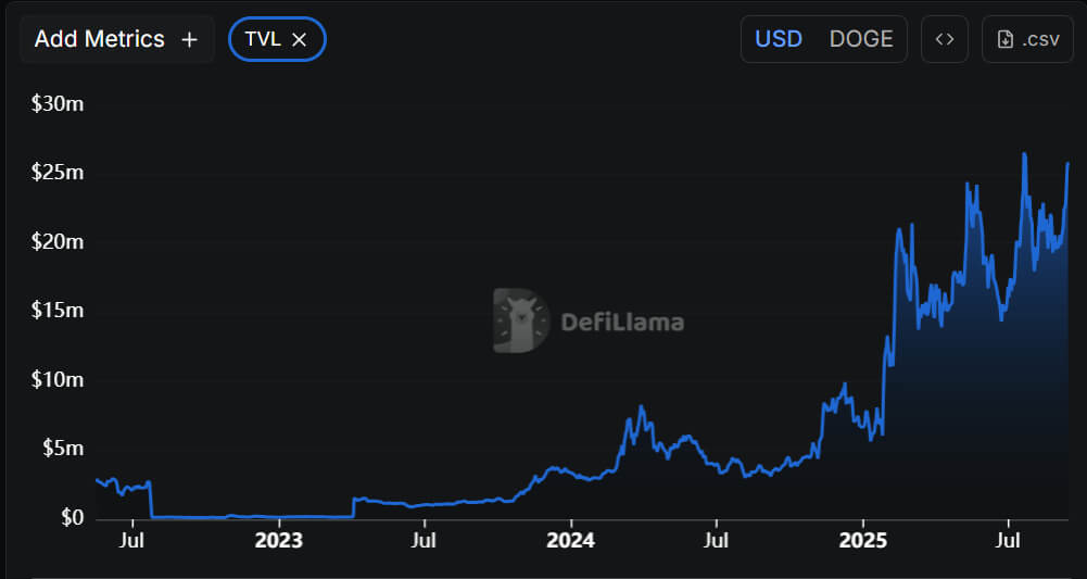The four-hour chart confirms a clear bullish breakout, with price maintaining a pattern of higher highs and higher lows. The latest data from DeFiLlama shows Dogecoin’s Total Value Locked (TVL) in decentralized finance stands at $25.88 million. TVL increased by 1.75% in the past 24 hours, supported by chain fees and revenue of $5,415 each.