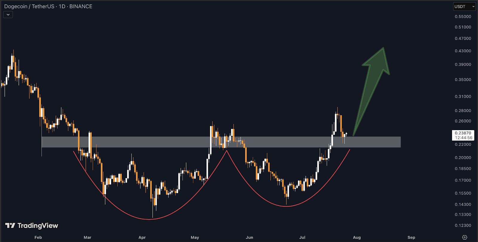 Technical projections based on the double bottom pattern suggest a potential price target of $0.50. The distance from the bottom of the pattern to the neckline, when projected upwards, aligns closely with this target. Historically, this level also served as a significant resistance zone in early 2022.