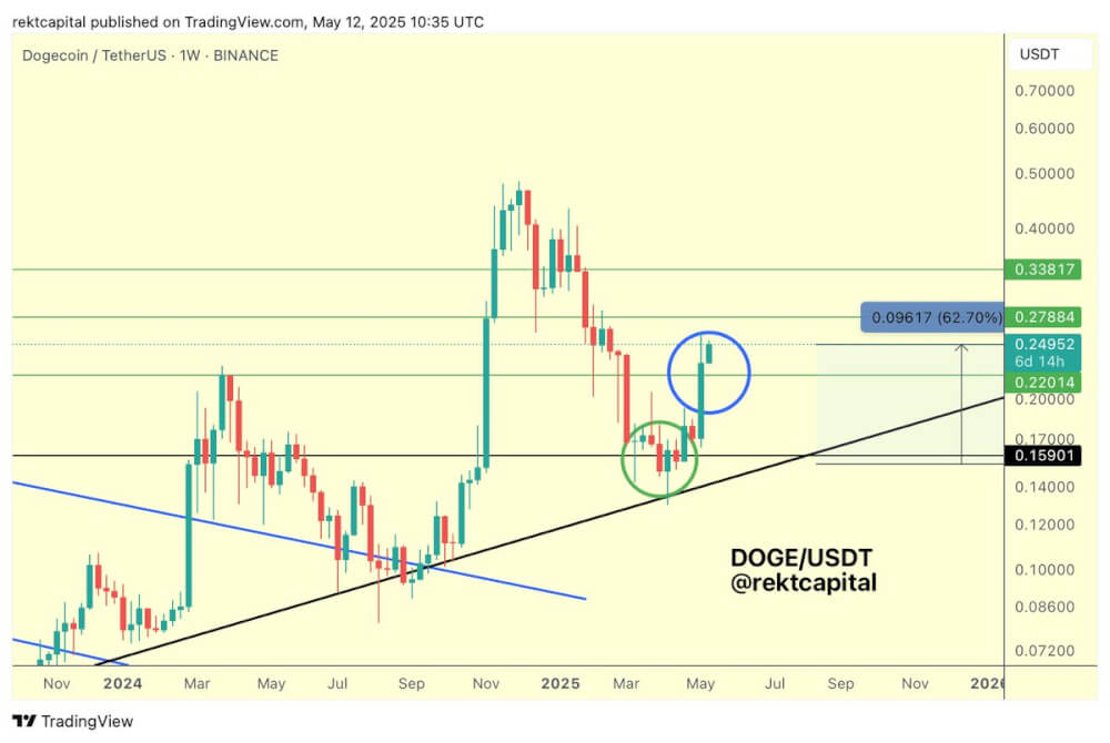 Further bolstering the bullish outlook, Rekt Capital highlights early signs of this level's reclamation on the daily chart. A successful breakout and retest (indicated by a green circle on the chart) confirms this trend continuation. This breakout has fueled a 62.70% rally, pushing Dogecoin near $0.22. The next target appears to be $0.27, aligning with the upper resistance zone shown on the chart.