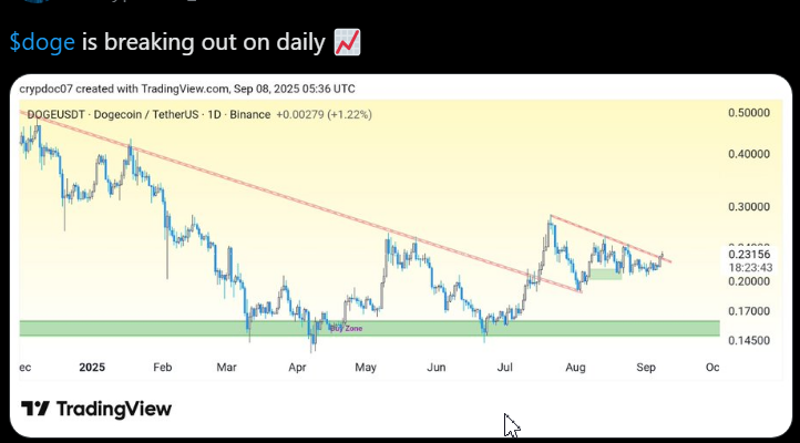 - Dogecoin has broken above its descending trendline, ending a prolonged consolidation phase.