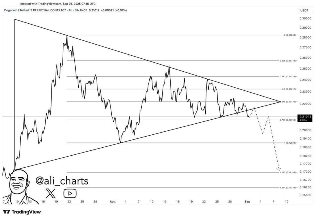 - Analyst Ali warns a close below $0.20760 may lead to a drop toward $0.19093, extending risks to $0.17166.