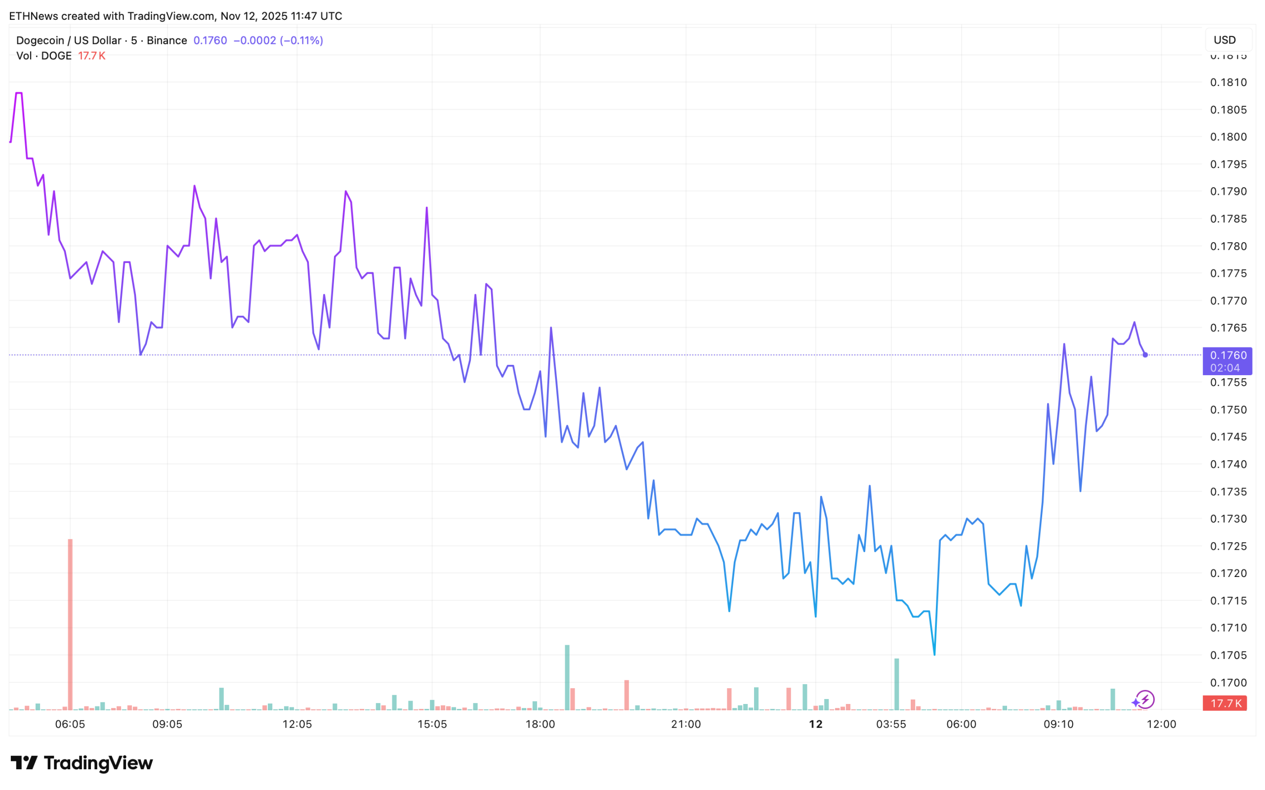 TradingView data from November 12 indicates that buyers continue to defend the $0.17 level, confirming it as short-term support. The combination of rising weekly lows and consolidating volume often precedes major directional expansion, a structure consistent with historical DOGE rallies.