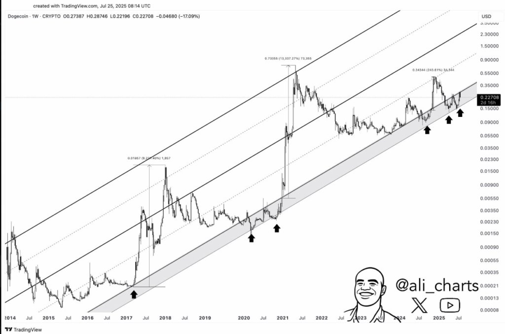 Dogecoin price is currently testing the same support range observed in past cycles, suggesting a potential repetition of the multi-year trend.