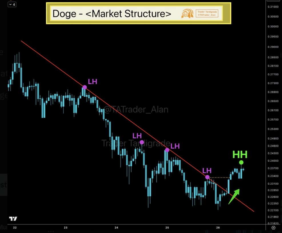 Following the HH, analysts are focusing on the next higher low, which will signal a trend reversal. If Dogecoin's price establishes this higher low and sustains an upward movement, intraday targets may extend to around $0.24 and potentially above $0.255.