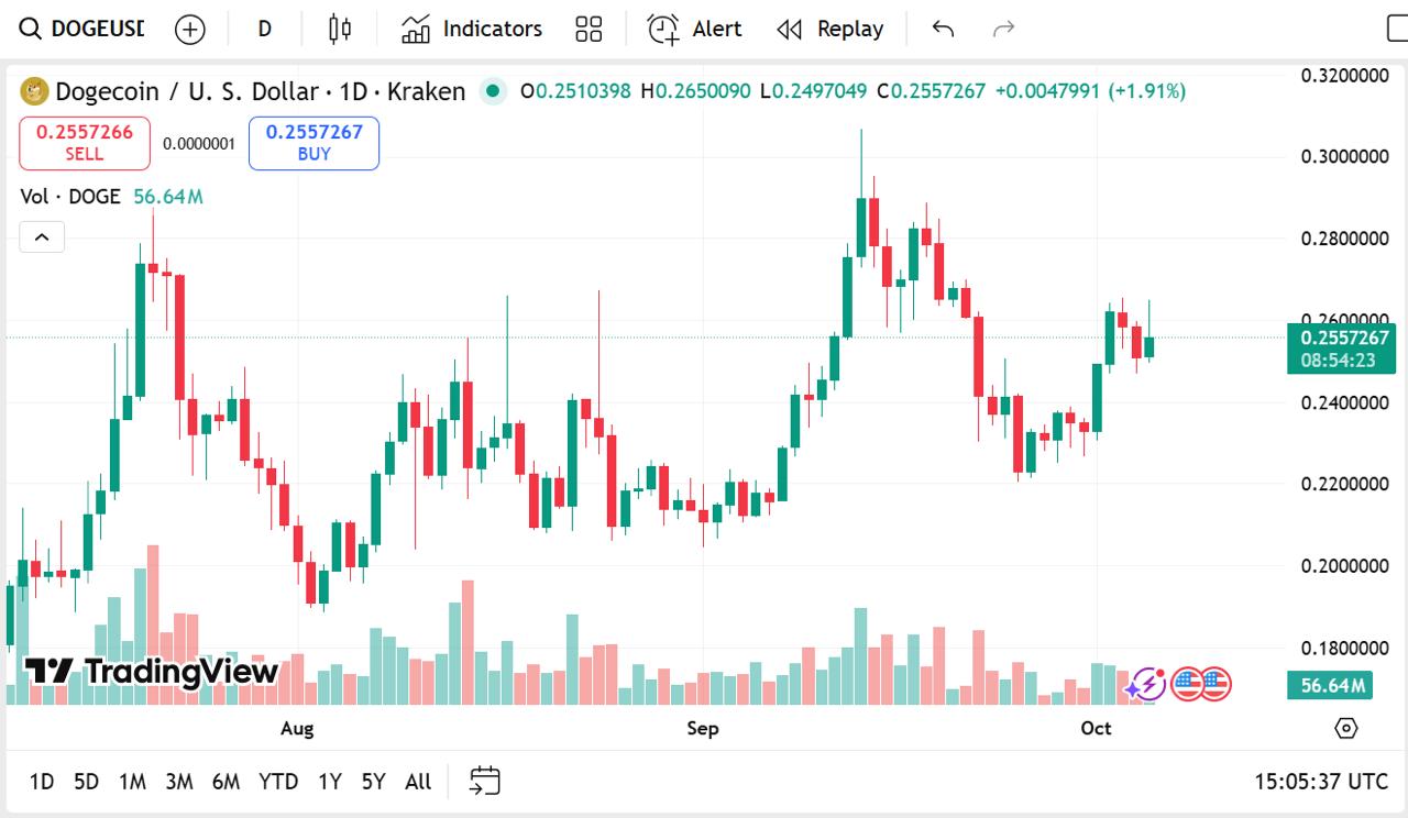 Dogecoin is currently selling at $0.2557, after a significant increase of 4.25% over the last 24 hours. With a market capitalization of $39.83 billion and trading volume of $2.85 billion—down 7.38%—Dogecoin remains one of the top crypto under $1 with active utility in digital tipping and global payments.
