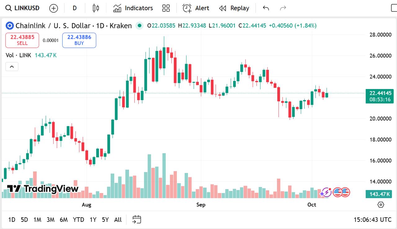 Chainlink (LINK) has also drawn attention this month as a critical DeFi infrastructure project enabling secure data transfer between blockchains. Currently priced at $22.44, up 3.75%, Chainlink holds a market cap of $15.37 billion with a trading volume of $841.73 million, which is down 10.96%.