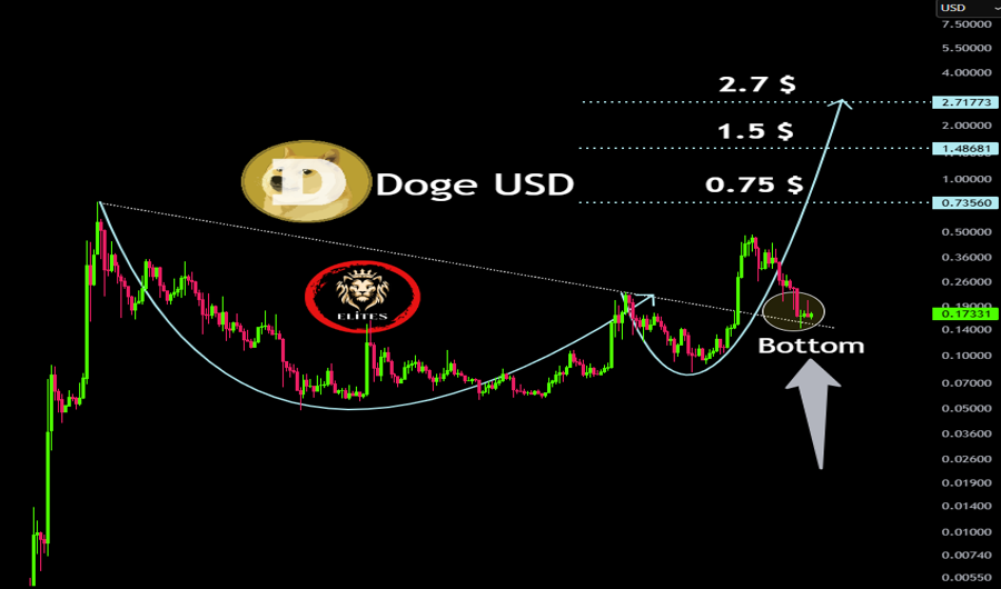 CryptoELITES, a market analyst, identified a "cup and handle" pattern on DOGE's price chart—a classic bullish indicator. The analyst noted a significant sentiment shift as DOGE emerged from a rounded bottom, suggesting a forthcoming breakout. Their analysis projects a parabolic trajectory, with potential price targets at $0.75, $1.50, and $2.70.