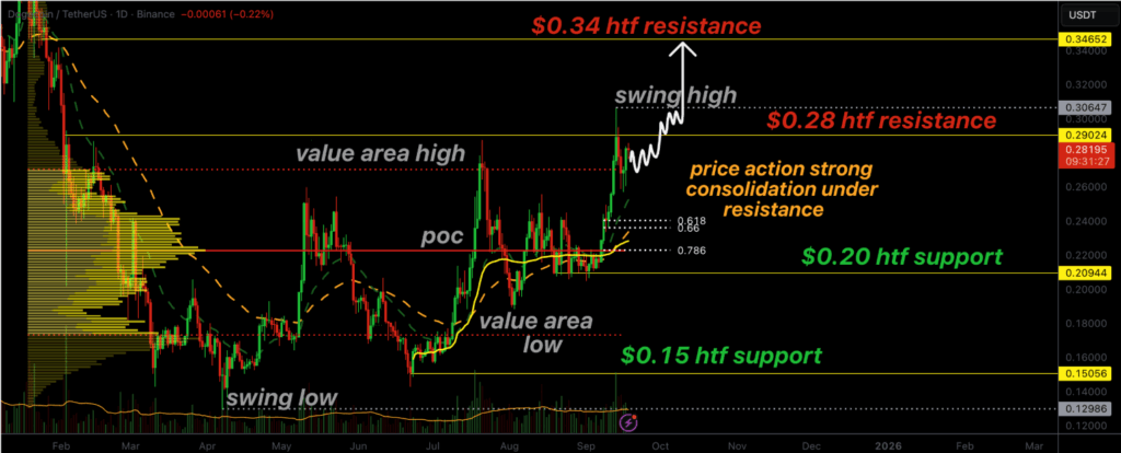 - Dogecoin remains bullish with higher lows intact, and consolidation under resistance signals accumulation before a potential breakout.