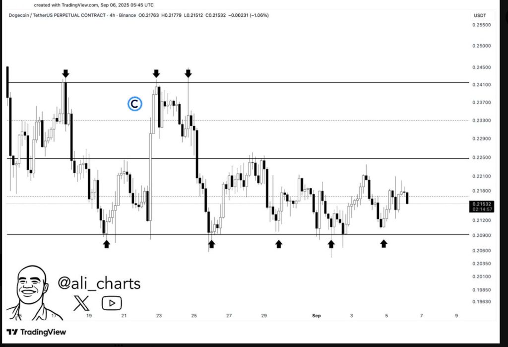 Crypto analyst Ali Charts noted that $0.209 has become a crucial support for Dogecoin. He stated on social platform X, “$0.209 is the key support for Dogecoin $DOGE, tested five times already.” Dogecoin has held this level for almost 50 days.