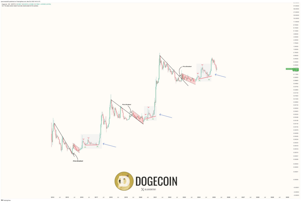 Since 2014, Dogecoin has exhibited three major cycles, each beginning with a descending trendline followed by a breakout. The first (2014-2017) and second (2018-2021) cycles both resulted in substantial price surges. A third cycle is now forming, mirroring previous trends, with the price remaining above key support levels, consistent with patterns preceding past breakouts.