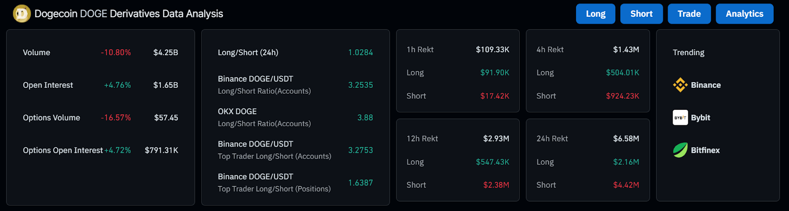 Recent derivatives liquidation data reveals significant volatility. In the last 24 hours, short liquidations totaled $4.42 million, while long liquidations reached $2.16 million, highlighting the price fluctuations in DOGE.