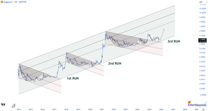 In the latest chart section, EᴛʜᴇʀNᴀꜱʏᴏɴᴀL identifies what may be the early stages of Dogecoin’s third run. The asset is currently trading within the mid-range of a rising channel, forming a pattern consistent with past accumulation phases before breakout events. The arrow of projection on the chart indicates that it is headed to the higher levels in the channel and there is a possibility of gradual appreciation in case the structure is not damaged.