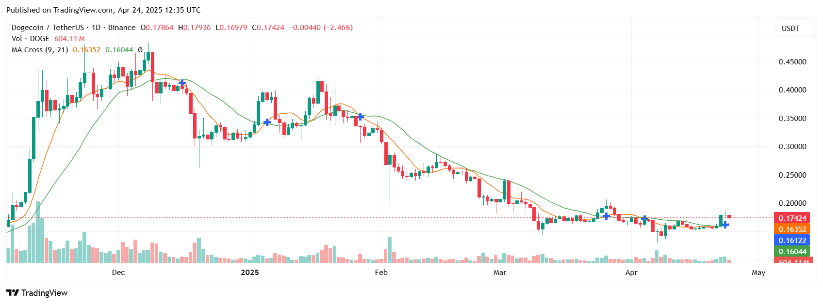 This development may prompt traders to liquidate long positions, potentially increasing selling pressure and driving DOGE's price lower. At the time of writing, DOGE traded at $0.1742, a 5.57% decrease over the past 24 hours. After reaching a low of $0.1703, the price experienced a slight rebound.