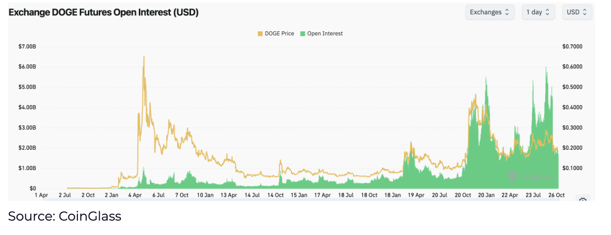 According to CoinGlass data, open positions in Dogecoin futures plummeted by over 65%, from a peak of $5.03 billion on October 7 to $1.70 billion by November 1. Similarly, trading volume decreased by 74%, from $20.45 billion to $1.34 billion since October 11. This decline signals a rapid waning of investor interest.