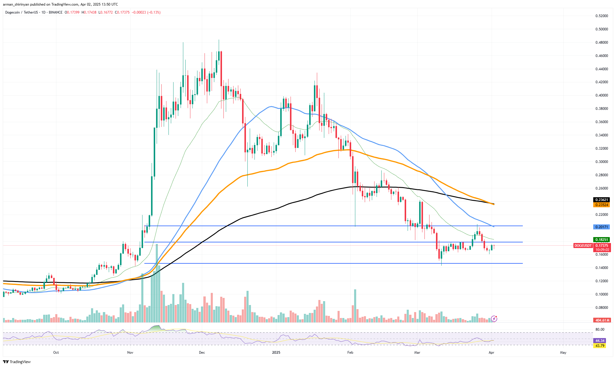 Dogecoin is currently trading within a tight range, bounded by three key support and resistance levels that will likely influence its near-term price action. Currently priced at $0.173 (slightly down for the day), it shows signs of indecision, hovering in the middle of this range.