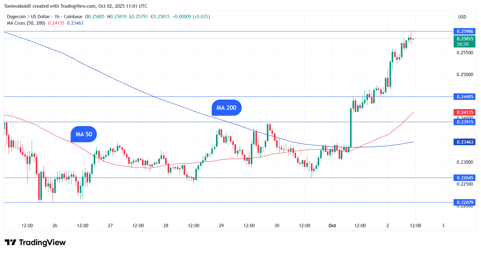 Dog-themed cryptocurrency Dogecoin (DOGE) has confirmed a golden cross, which incidentally is the first such in October, a historically positive month for the markets, referred to as "Uptober" in crypto parlance.