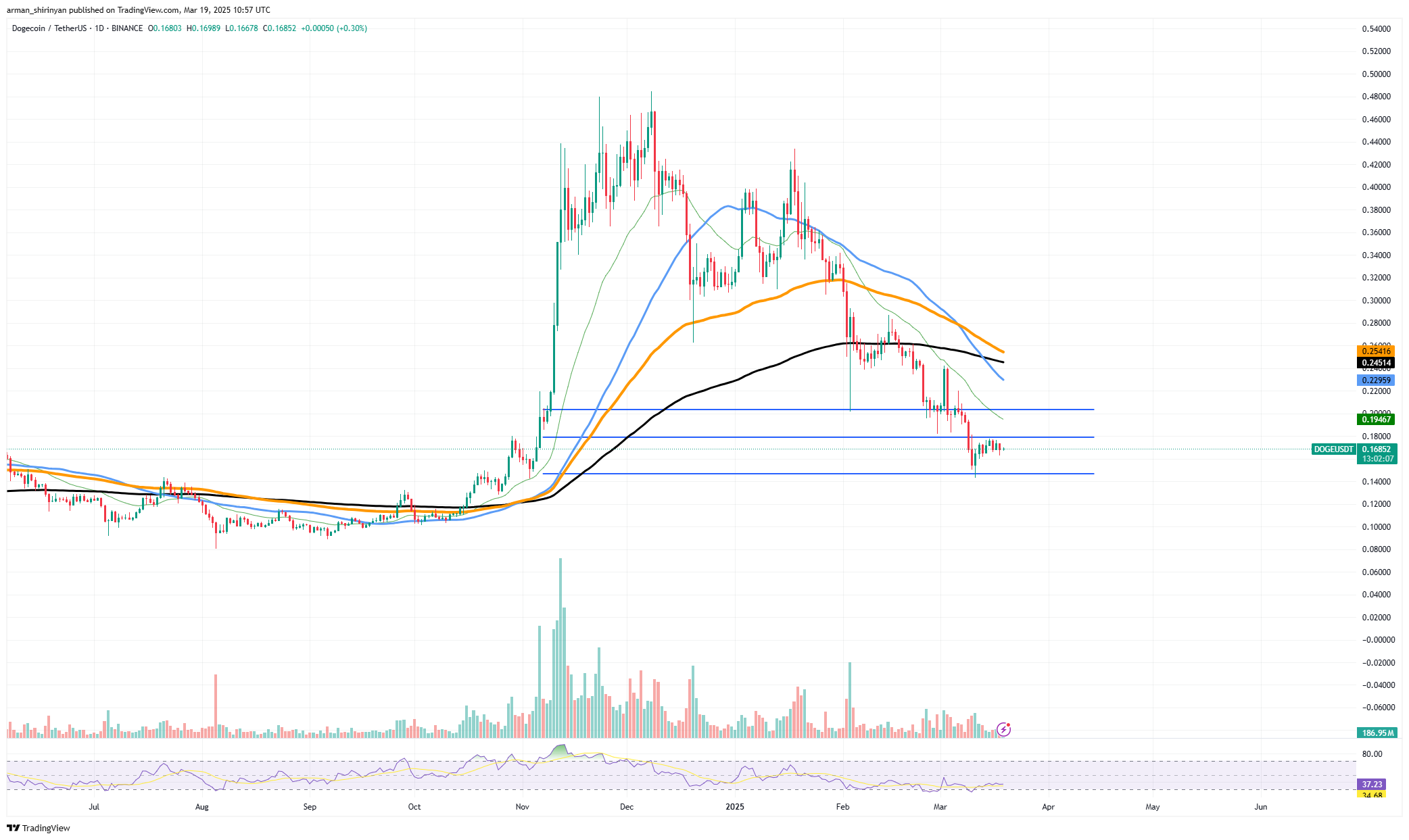 The price chart shows Dogecoin repeatedly failing to break through significant resistance, particularly around $0.18. Lower highs are consistently forming, indicating weak bullish momentum. A death cross (where the short-term moving average crosses below the long-term moving average) further reinforces the prevailing downward pressure.
