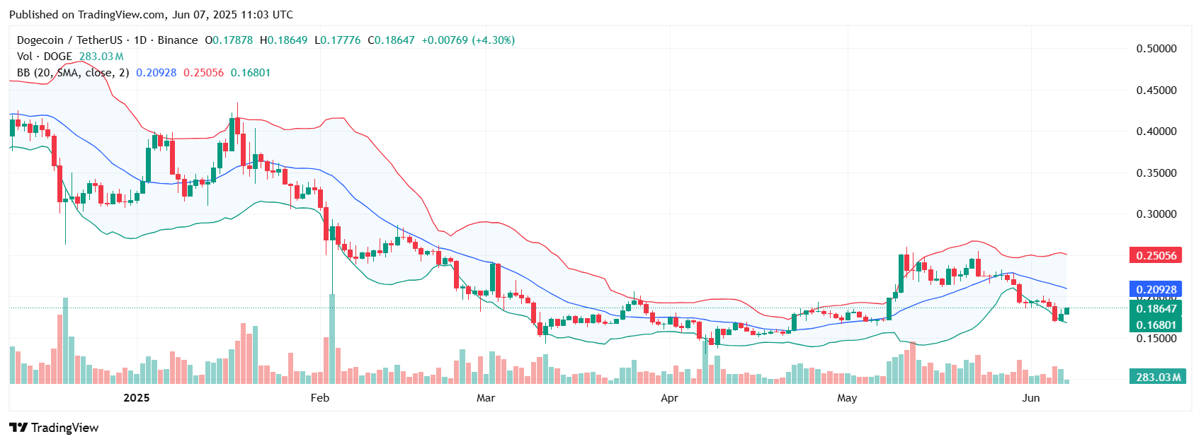 As of this writing, DOGE is trading at $0.1870, marking a 5.38% increase over the past 24 hours. This positive movement suggests a gradual return of buying interest.