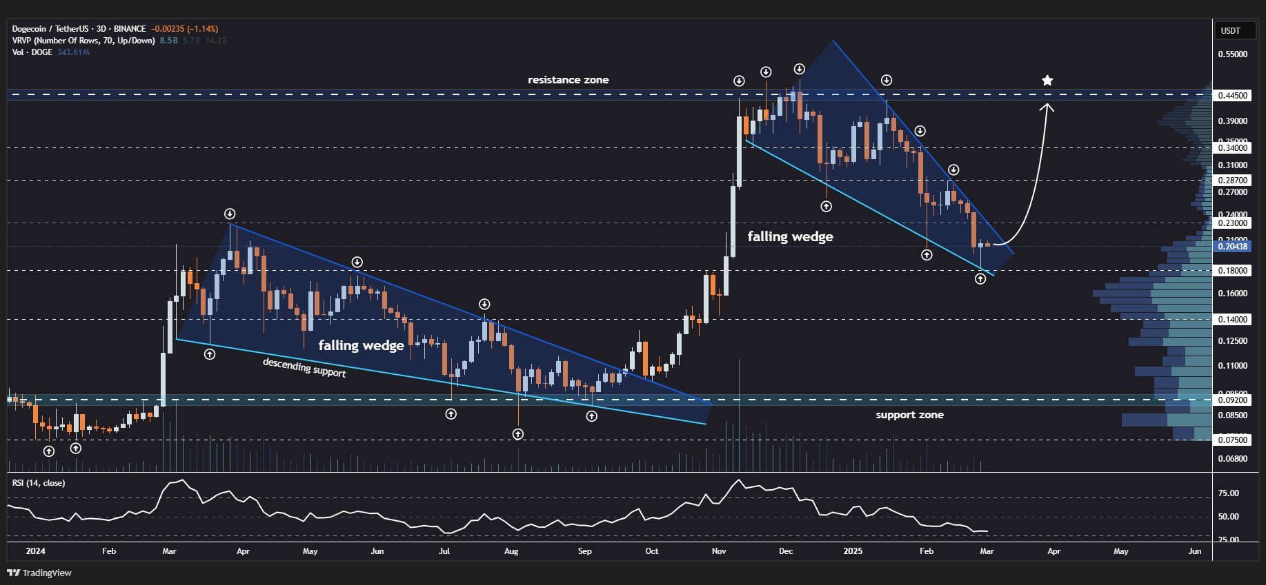 Sustained momentum could push DOGE to test the descending resistance and break out of the falling wedge. A successful breakout might lead to price targets including:
