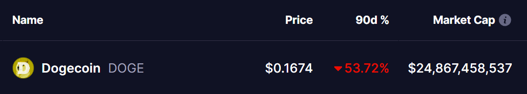 Dogecoin (DOGE) has experienced a significant downturn since its November 2024 peak of $0.48 (reached December 8th), currently trading at $0.16 after a 53% correction over the past 90 days.