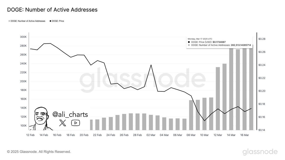 Following the price correction, investor activity has increased significantly. Crypto analyst Ali Martinez reports a surge in active addresses, exceeding 280,000 and reaching 282,513.