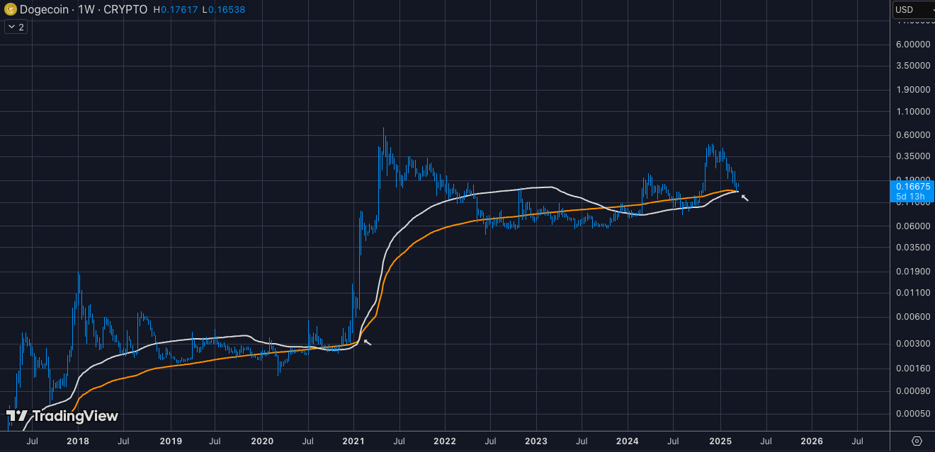 Analyst @_CryptoSurf's analysis reveals DOGE has reached a critical support level, coinciding with both the 100-week and 200-week moving averages. This confluence is a significant technical event often signaling a trend shift.