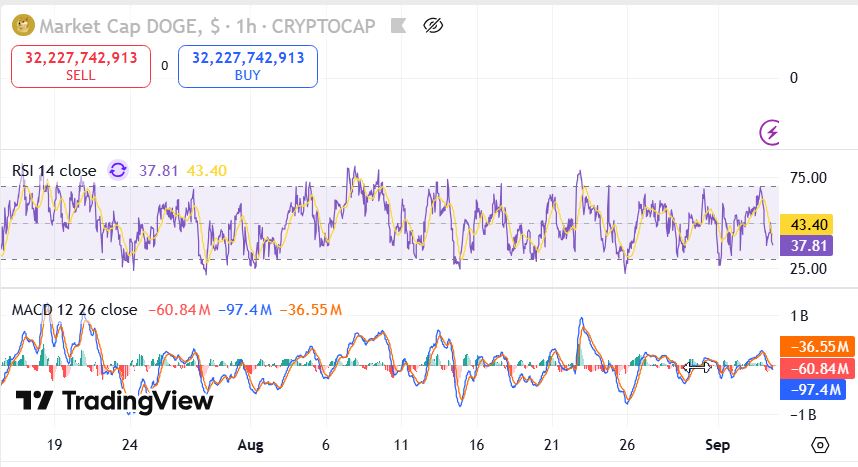 - MACD at -20.96M highlights reduced bearish strength, while market capitalization holds at $32.34B.
